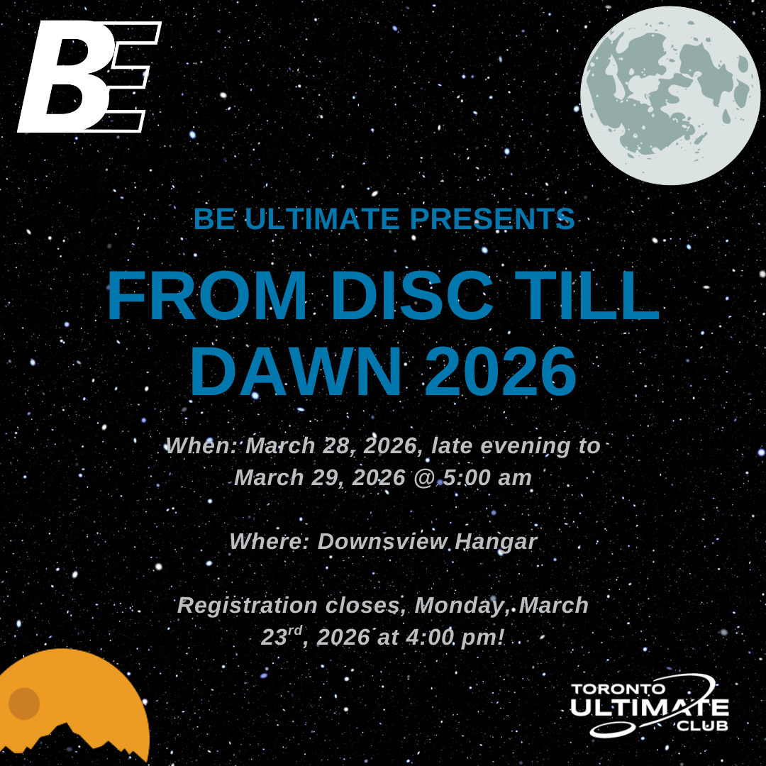We still have spots available for our annual overnight tournament, From Disc Till Dawn, being held at the Downsview Hangar, from 11pm on March 28th, to 5am on March 29th, 2026.
