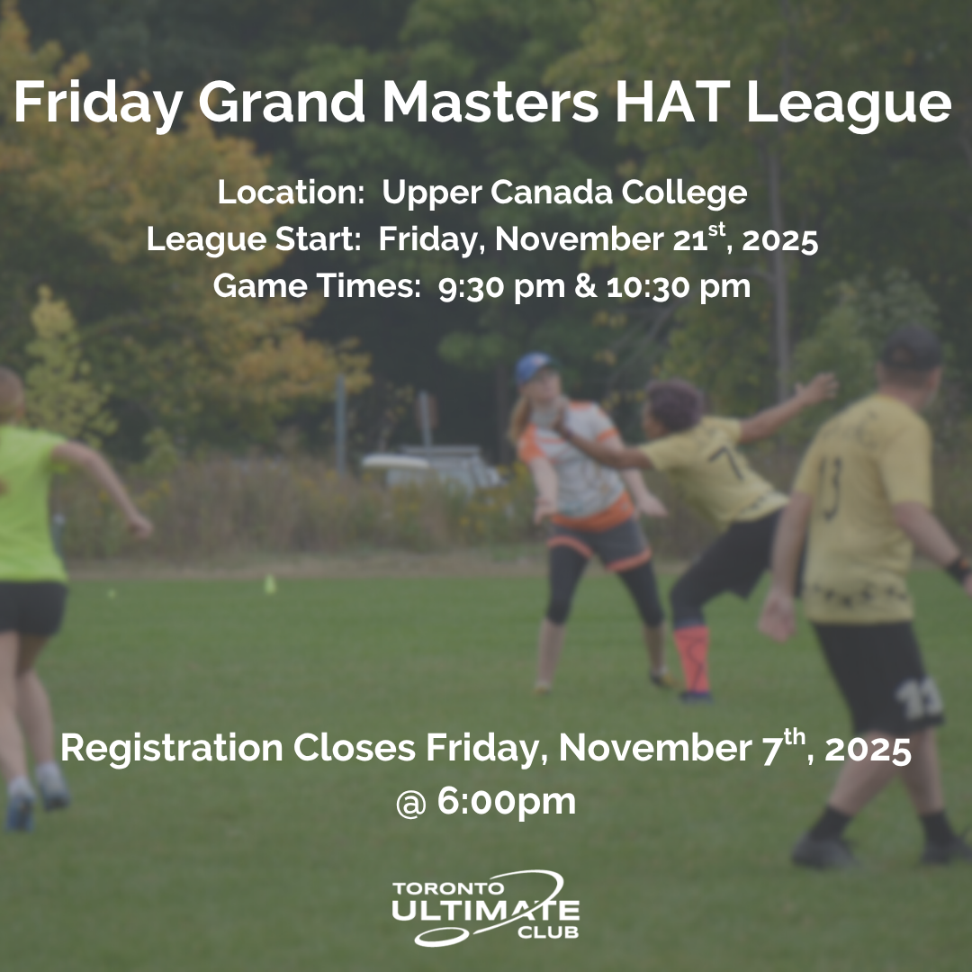 It’s almost go time! The Friday Grand Masters HAT League kicks off on November 21st at Upper Canada College, and registration closes Thursday, November 7th at 6:00 PM.